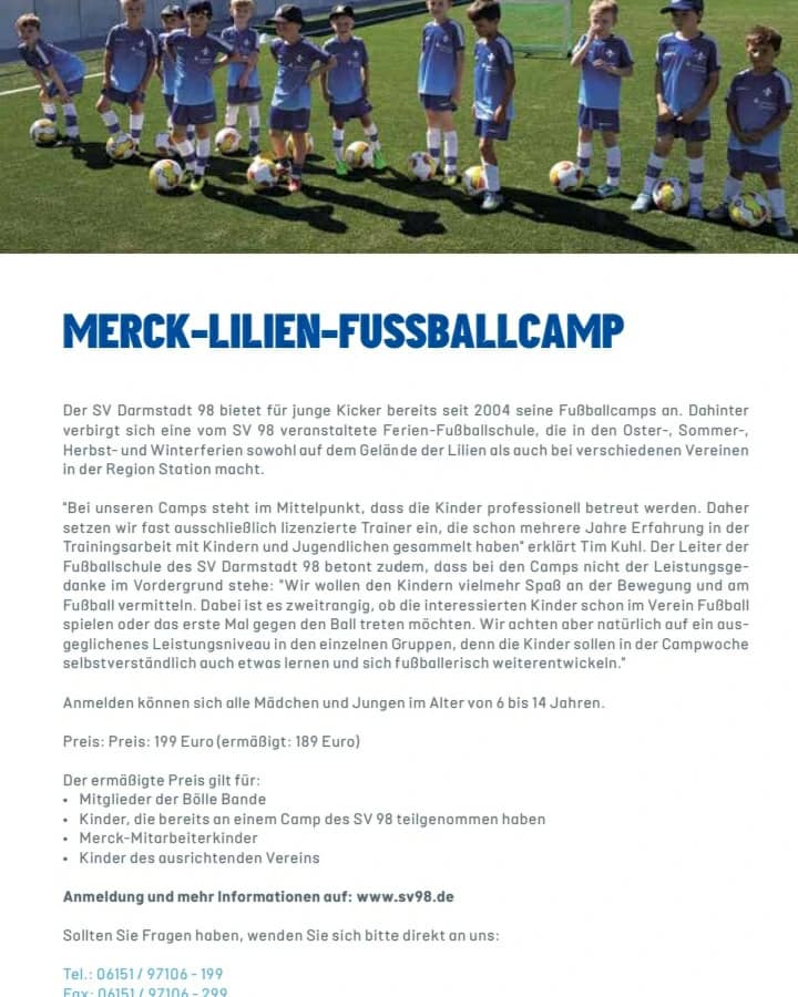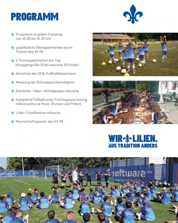 Der SV Darmstadt 98 bietet für junge Kicker bereits seit 2004 seine Fußballcamps an. Dahinter verbirgt sich eine vom SV 98 veranstaltete Ferien-Fußballschule, die in den Oster-, Sommer-,