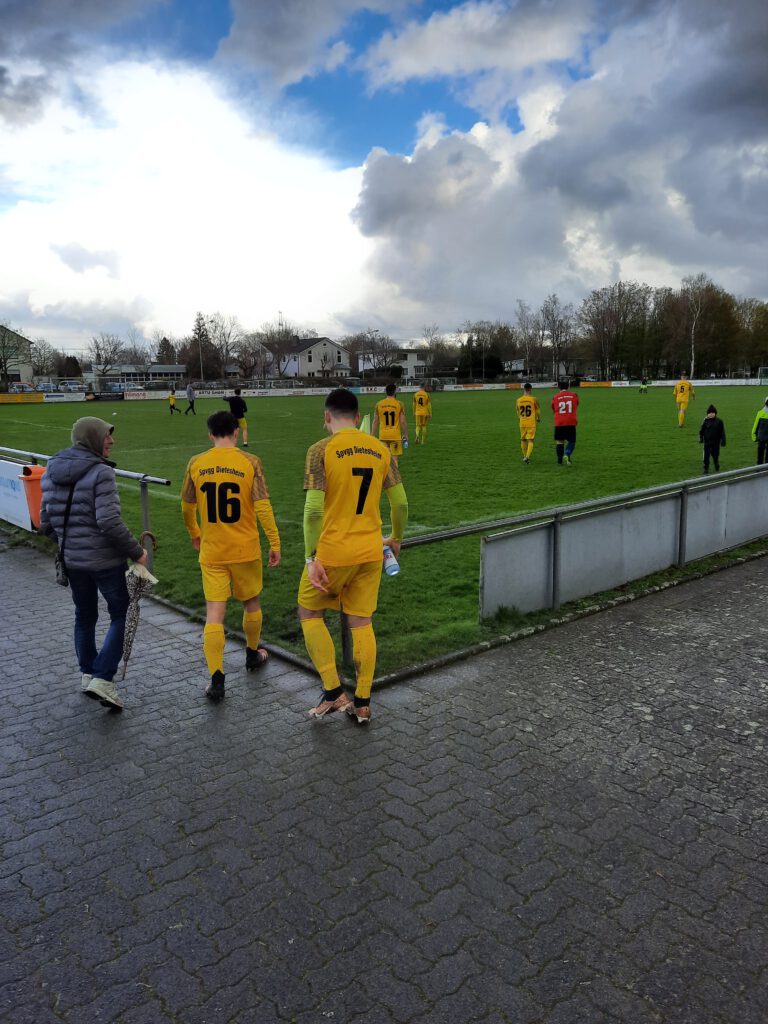 Um 15 Uhr startete dann bei weiter wechselhaften Bedingungen die Partie unserer Ersten Mannschaft gegen den FC Offenthal. Früh setzten unsere Jungs durch ihr schnelles Spiel die Abwehr von Offenthal unter Druck und so gelang es unserem Kapitän Rafael Mitsopolus direkt im ersten Angriff in der zweiten Minute der Führungstreffer. Nicht mit weniger Spielfreude und auch mit weiter hohem Tempo erhöhte Payam Khederzadeh, Elon Derguti und Sebastian Röhl (durch einen Elfmeter) früh auf 4 zu 0. Vor den nun zwei spiefreien Wochenenden ermahnte in der Halbzeit das Trainerteam um Hoffmann und Arnitali nicht das Tempo aus dem Spiel zu nehmen und weiter mit Spielfreude Richtung Tor zu spielen. Den knapp 100 Zuschauern sollte dieser Wunsch auch erfüllt werden und so erhöhte Mitsopolus auf 5 zu 0. Der FC Offenthal verkürzte zwar kurz um einen Treffer, Mitsopolus netzte aber zwei weitere Male und Dietesheim konnte somit auf 7 zu 1 erhöhen.